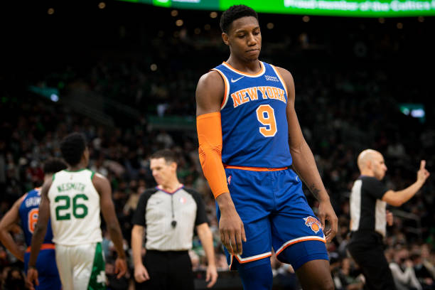 BOSTON, MASSACHUSETTS – JANUARY 08: RJ Barrett #9 of the New York Knicks reacts during a game against the Boston Celtics at TD Garden on January 08, 2022 in Boston, Massachusetts. (Photo by Maddie Malhotra/Getty Images)
